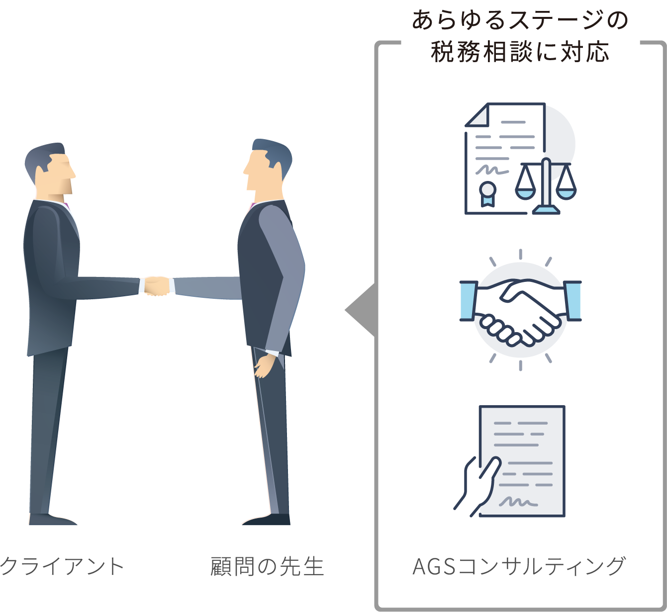 ⾼度かつ複雑な国際税務の領域を正しく処理することにより、クライアント様には税務リスク低減・ステークホルダーからの信用度アップというメリットがあります。会計士・税理士の皆様にとっては、クライアント様のビジネスニーズに即した税務対応を行うことにより、信頼関係の強化が図れます。AGSは、会計士・税理士の皆様が抱える国際税務の幅広い課題に伴走することで、会計士・税理士の皆様とクライアント様との関係強化をご支援いたします。そしてその先に、会計士・税理士の皆様、クライアント様とそのステークホルダーの皆様との“三方良し”を目指してまいります。