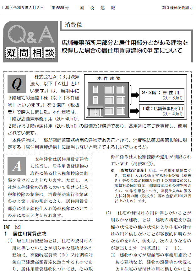 AGS税理士法人(本社:東京都千代田区、統括代表社員:廣渡嘉秀、和田博行。)の大仲政人 税理士は、一般財団法人 大蔵財務協会が発行する「国税速報」第6888号(2026年3月2日発行)のQ&A疑問相談コーナーにおける「店舗兼事務所用部分と居住用部分とがある建物を取得した場合の居住用賃貸建物の判定について」を執筆しました。